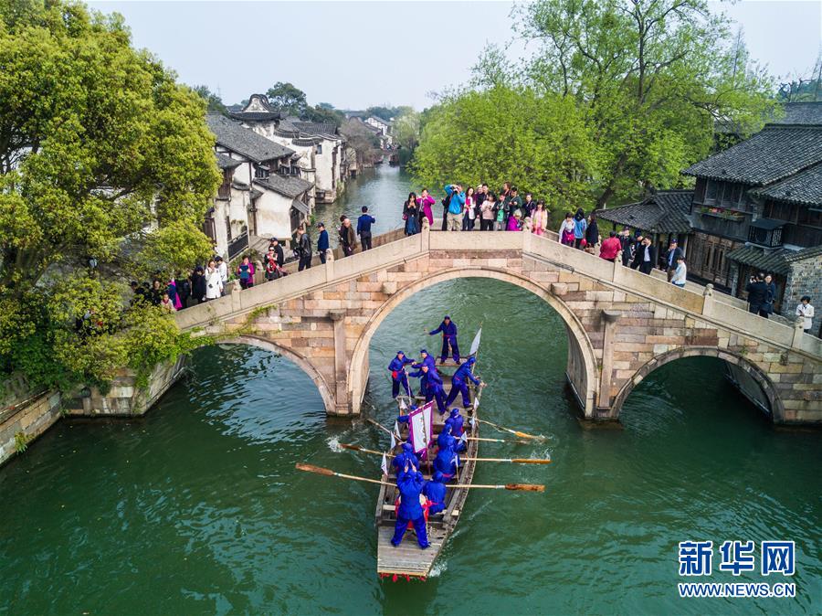 3月29日,烏鎮(zhèn)水鄉(xiāng)百姓在烏鎮(zhèn)西柵景區(qū)參加名為“踏白船”的傳統(tǒng)水上競(jìng)技活動(dòng),吸引游客前來(lái)感受水鄉(xiāng)獨(dú)特的民俗風(fēng)情?!疤ぐ状备?jìng)賽的目的是為了祈求蠶桑豐收。