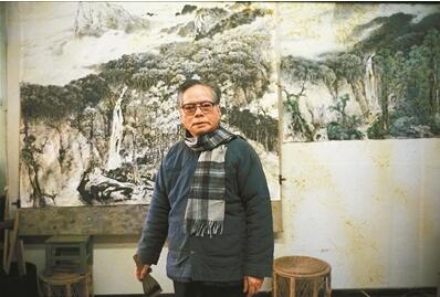 1983年,關(guān)山月在創(chuàng)作的《碧浪涌南天》前留影。