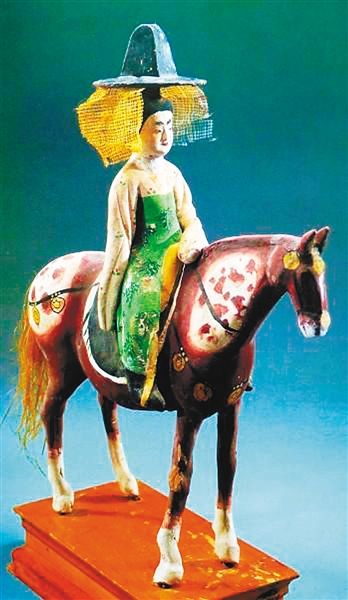 但細(xì)看這幅圖,所謂“羃”只是在寬檐帽下垂有帶狀物,不足以將全身遮蔽,很難說(shuō)真的就是“羃”。因此關(guān)于“羃”的形制,還有待文物資料的繼續(xù)發(fā)現(xiàn)?!傲]”之外,“帷帽”的形制又是如何?從上面的介紹可知,帷帽的特點(diǎn)是“拖裙到頸,漸為淺露”。從這一點(diǎn)出發(fā),1972年新疆吐魯番唐墓出土的“彩繪騎馬仕女泥俑”,有人認(rèn)為所戴就是帷帽。