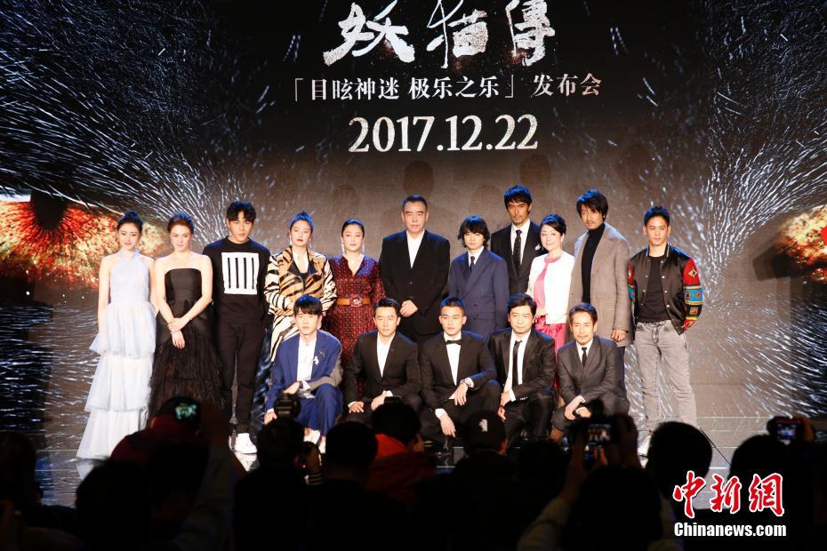12月17日,由陳凱歌導(dǎo)演的賀歲奇幻題材電影《妖貓傳》在北京舉行全球首映發(fā)布會(huì),導(dǎo)演陳凱歌,制片人陳紅攜主演黃軒、染谷將太、張雨綺、秦昊、張榕容、張魯一、劉昊然、阿部寬、松坂慶子等亮相。影片改編自日本作家夢(mèng)枕貘的魔幻系列小說《沙門空?!罚瑢⒂?2日起在中國(guó)內(nèi)地上映。圖為眾主創(chuàng)合影。