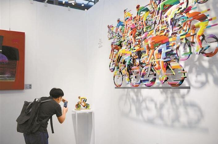 參展商“譽(yù)美國(guó)際”的展臺(tái)外墻上,一場(chǎng)疾馳中的跑馬比賽正酣。將不銹鋼板切片組合,飾以熱情而愉悅的色彩,這兩組風(fēng)格極具個(gè)性化的墻面雕塑作品,均來自以色列國(guó)寶級(jí)藝術(shù)家大衛(wèi)·格斯坦,引得不少觀眾駐足欣賞。
