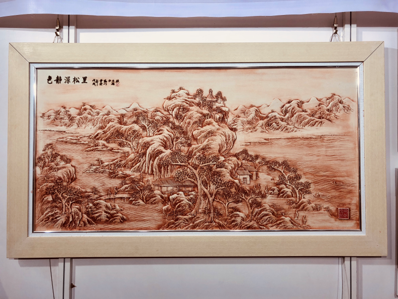 這是曹愛(ài)勤首次參加深圳文博會(huì),帶來(lái)了她所創(chuàng)作的陶瓷、篆刻、書畫等多種形式的藝術(shù)作品,可以看到其不同形式作品的創(chuàng)作技法、主題、表現(xiàn)手法等均有較大差異,充分體現(xiàn)了曹愛(ài)勤在陶瓷藝術(shù)道路上追求卓越、勇于創(chuàng)新的新時(shí)代大國(guó)工匠精神。在其創(chuàng)作中,特別是作為中國(guó)陶瓷重要組成部分的陶瓷雕刻作品《色靜深松里》、《八仙過(guò)?!?,承載了國(guó)畫、雕刻、裝飾等綜合性藝術(shù)手法,每件作品都充分體現(xiàn)出工匠技能,堪稱學(xué)貫中西、熔鑄古今之珍品。