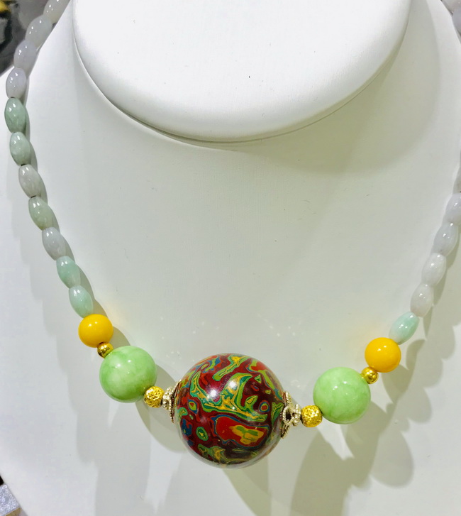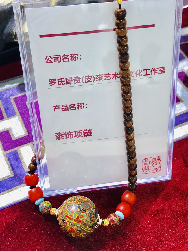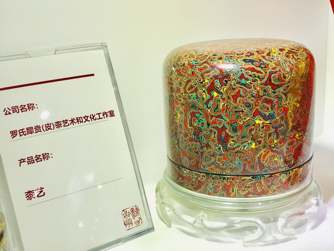 浙江省組團(tuán)的展位在會(huì)展中心2號(hào)館,規(guī)模不小,羅獻(xiàn)兵老師的漆藝作品都比較精致,但展位卻比較舒展。一眼望去,五彩斑斕的漆藝作品令人眼花繚亂,精神為之一震,主要作品有犀皮漆扇、印盒、糖果盒、竹胎茶杯、腰墜以及手串和漆珠等。前來(lái)參觀的人不少,但從他們的言談中得知了解的并不多,多為其絢麗的光彩所吸引。