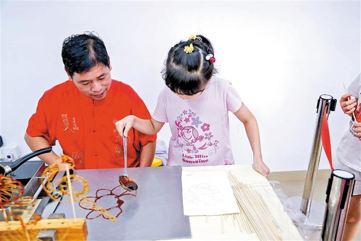 系列活動(dòng)中最受小朋友歡迎的還要屬糖畫了。糖畫是一種傳統(tǒng)民間手工藝,以糖為材料來作造型的。所用的工具僅一勺一鏟,糖料一般是紅、白糖加上少許飴糖放在爐子上用溫火熬制,熬到可以牽絲時(shí)即可用來澆鑄造型了。陪伴小朋友們的家長(zhǎng)表示,孩子親自動(dòng)手制作,既能加深對(duì)民間藝術(shù)的認(rèn)識(shí)和濃厚興趣,又能增強(qiáng)動(dòng)手能力,十分有意義。而小朋友們則認(rèn)為,不光可以學(xué),還可以吃,真好。