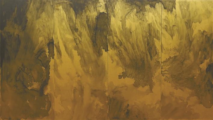 此次展出的作品《山外之山中》泥金四條屏令人耳目一新。他借助屏風(fēng)的形式,使用泥金這一材料,以大開大闔的磅礴氣勢(shì),展現(xiàn)了蘇軾筆下“不識(shí)廬山真面目,只緣身在此山中”的意境。