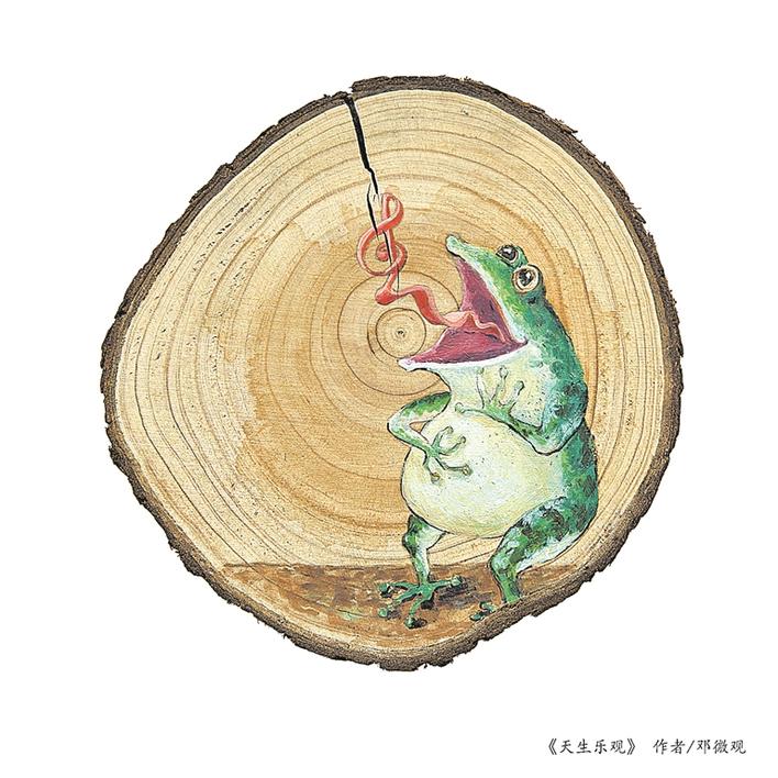 上榜漫畫家鄧微觀系深圳市寶安區(qū)打鐵文藝社社長,其《感物系列》以見物興感為主線,展開豐富的想象力,用動物擬人的方式幽默詼諧地抒發(fā)人生感悟,讓人會心一笑之余引起共鳴,令觀眾感嘆藝術(shù)家的漫無邊際的“腦洞”。對于作品首次入選國內(nèi)美術(shù)界規(guī)格最高的國展,鄧微觀很興奮:“這是對我這個系列作品的高度肯定。”《感物系列》系列作品源于他閑逛發(fā)呆時的想象碎片,將這個碎片貫穿就成了這個系列作品。鄧微觀在茶余飯后經(jīng)常到鐵崗的西鄉(xiāng)河邊散步,河中不時傳來低頻厚實的“男低音”引起他的注意,此起彼伏,聽來如交響曲一般通達舒暢。他循聲尋覓,原來是蛤蟆的聲音,只見這些“音樂家”在下水道洞口,在草叢中,河道縫中快樂地歡唱……這些天生的樂觀者給鄧微觀帶來美妙的心情,所以創(chuàng)作了這幅《天生樂觀》。再如《三餐之余》,有時飯后經(jīng)常會在茶幾前發(fā)發(fā)呆,思考人生不應(yīng)該只是面包和蘋果,還應(yīng)有點別的……