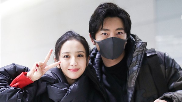 佟麗婭郭京飛賣萌合影 個性羽絨服俏皮減齡