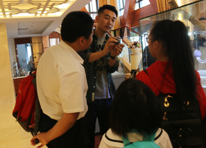 在現(xiàn)場(chǎng),此次展覽的合作方——上海雍荷堂香館和深圳望野博物館呈現(xiàn)了數(shù)十件珍稀沉香藝術(shù)品和館藏香器珍品。來(lái)自深圳望野博物館的程海龍老師和上海雍荷堂香館的湯益強(qiáng)老師分別給小記者們現(xiàn)場(chǎng)講解了參展文物的歷史和相關(guān)知識(shí),同時(shí)湯益強(qiáng)老師還給小記者們做了傳統(tǒng)的香道技藝表演。