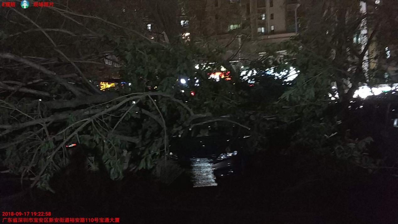 坐標寶安,17日晚,95589接到客戶報案車輛被大樹壓砸,接到報案后查勘員3分鐘內(nèi)聯(lián)系客戶,指引理賠手續(xù)。15分鐘內(nèi)到達現(xiàn)場。指引客戶到太平財險合作車行進行維修。