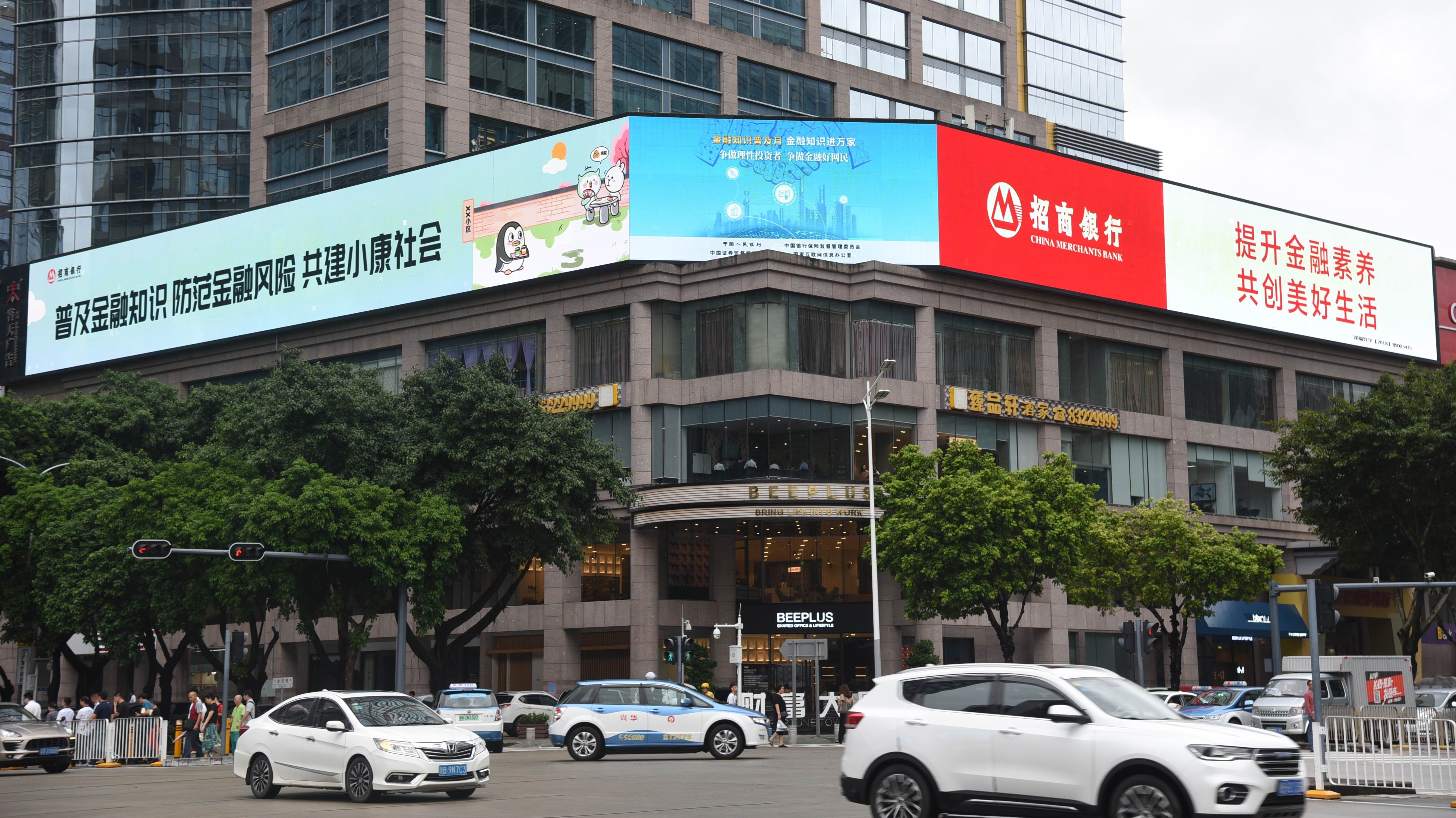 招商銀行除布局全轄網(wǎng)點(diǎn)營業(yè)廳滾動播放活動口號、總分行特色金融宣教片外,同時在財富大廈三面LED電子屏投放大型戶外廣告,進(jìn)一步擴(kuò)大宣教受眾面,消保品牌宣傳效果顯著。