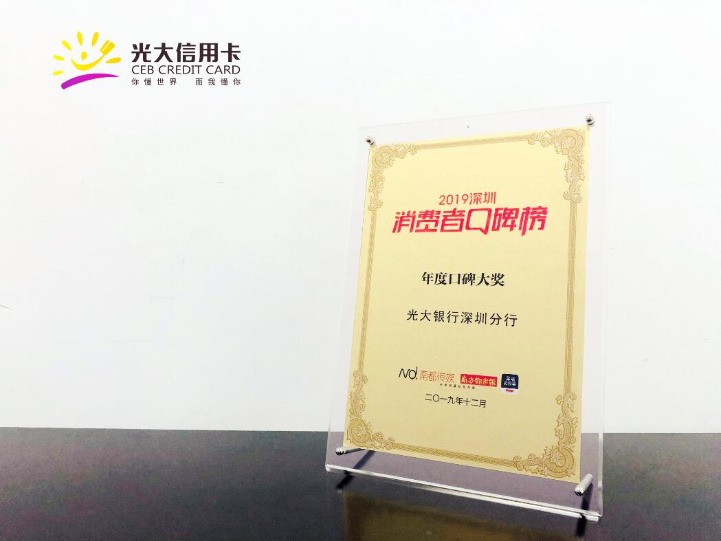 近年來光大銀行深圳分行積極開拓貼近民生的消費場景,努力踐行“市場即獲客,獲客即市場”理念,加強場景建設,提升客戶活躍度及品牌影響力,最終從百家機構角逐中脫引而出,榮獲“2019年度消費者口碑獎”,成為致敬改革開放40周年經(jīng)典品牌。