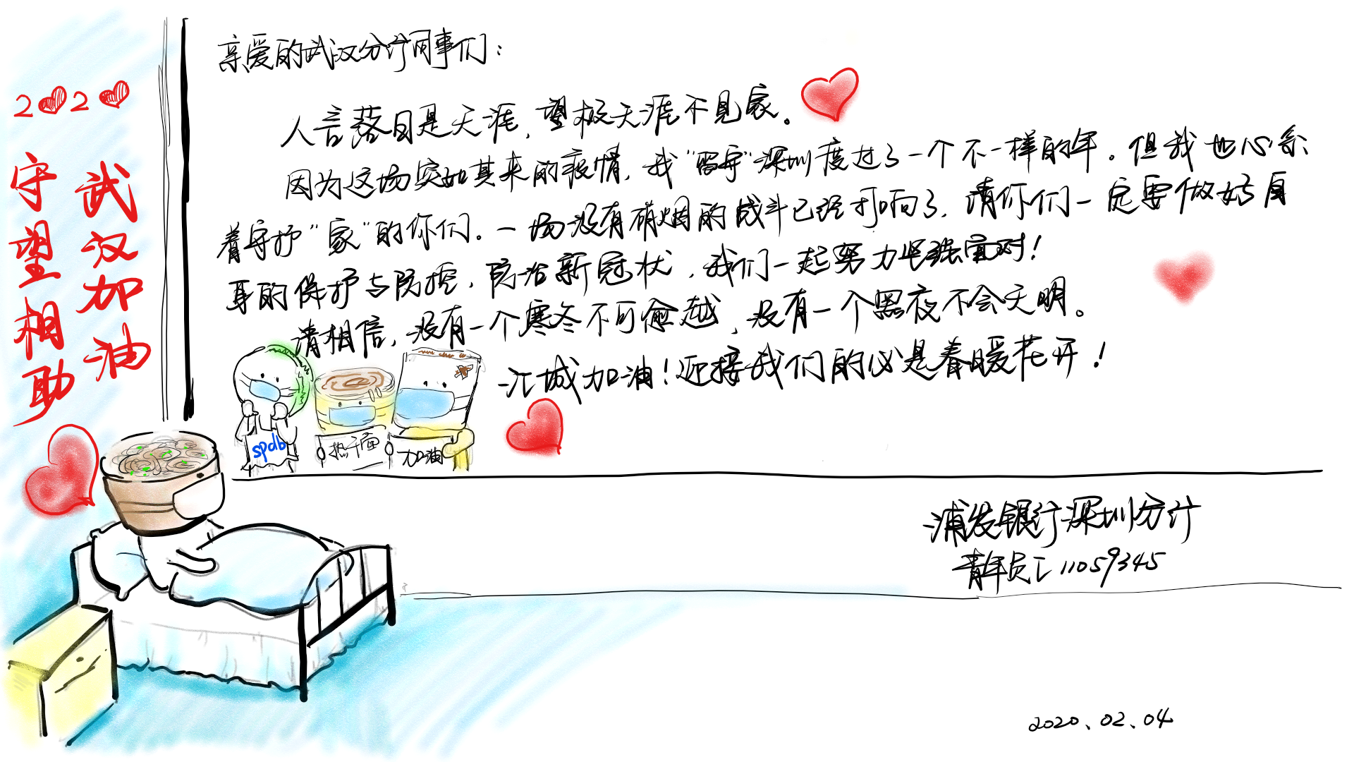 2月3日,浦發(fā)銀行深圳分行團委向全體青年員工發(fā)出了一封倡議書。在倡議書中,該行團委號召廣大團干部、團員青年立即行動,充分發(fā)揮黨的助手和后備軍作用,展現(xiàn)青年突擊隊作為,為堅決打贏疫情防控阻擊戰(zhàn)貢獻力量,并向青年提出三個要求:“堅定信心不迷茫,聽黨指揮勇?lián)敗?、“科學防范不信謠,眾志成城控疫情”、“居家辦公不離崗,服從指揮勇?lián)敗?。當日,浦發(fā)銀行深圳分行發(fā)起了給武漢分行同事寄送家書的活動,該行全體青年手寫家書,圖文并茂、紙短情長,表達了對疫區(qū)“戰(zhàn)友們”最深切的關愛和鼓勵,身體力行做好他們堅強的后盾。