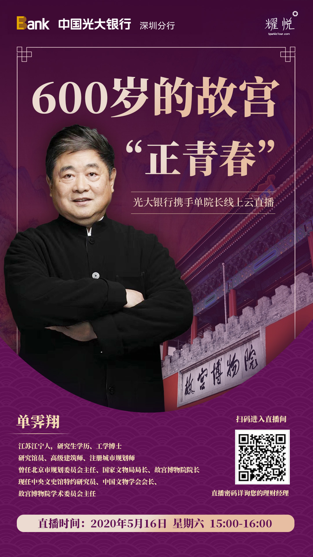 深圳新聞網(wǎng)2020年5月15日訊 他要來了,帶著600歲故宮的青春故事來了,來到《光大銀行“開講啦”!》第十二期。為了回饋客戶,讓廣大客戶更深入體會到故宮之美,光大銀行深圳分行特邀請原故宮博物館單霽翔院長,于5月16日(周六)下午3點(diǎn)-4點(diǎn)線上開講精彩課程《600歲的故宮“正青春”》,讓參與者從多個角度體驗(yàn)傳統(tǒng)文化之美。