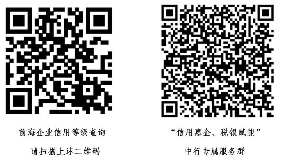 前海注冊企業(yè)可通過下左二維碼查詢前海信用等級,可通過下右二維碼加入“信用惠企、稅銀賦能”中行專屬服務群(入群請備注企業(yè)名稱),了解咨詢深圳中行針對前?!氨趟{企業(yè)”和“湛藍企業(yè)”的十項具體服務內容。(黃璜)