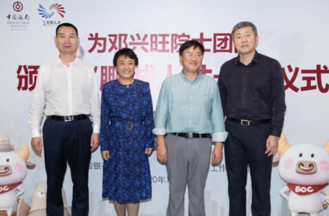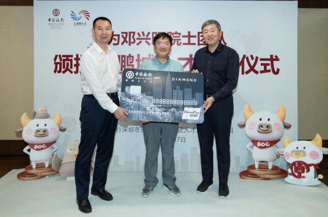 深圳新聞網(wǎng)·見圳客戶端2020年11月8日訊 昨日,深圳市光明區(qū)委常委、組織部部長繩萬青,中國銀行深圳市分行副行長韓竹代表深圳市光明區(qū)人才辦和中國銀行深圳市分行,為生物學家、美國國家科學院院士鄧興旺及部分團隊成員頒發(fā)了“中銀鵬城人才卡”鉆石卡,這是全市范圍內(nèi)首張向在深院士發(fā)放的“中銀鵬城人才卡”,標志著這張由光明區(qū)人才辦和深圳中行共同策劃推出的人才卡實現(xiàn)了市級認定的各層級人才全覆蓋。鄧興旺院士是深圳市杰出人才獲得者、深圳市作物分子設(shè)計育種研究院院長、深圳興旺生物種業(yè)有限公司董事長,他帶領(lǐng)團隊2010年到深圳創(chuàng)業(yè),多年來在水稻領(lǐng)域取得兩項重大技術(shù)突破,其中“潔田模式”大規(guī)模市場示范面積達到50萬畝,有效加快了中國農(nóng)業(yè)的輕簡化、現(xiàn)代化步伐。