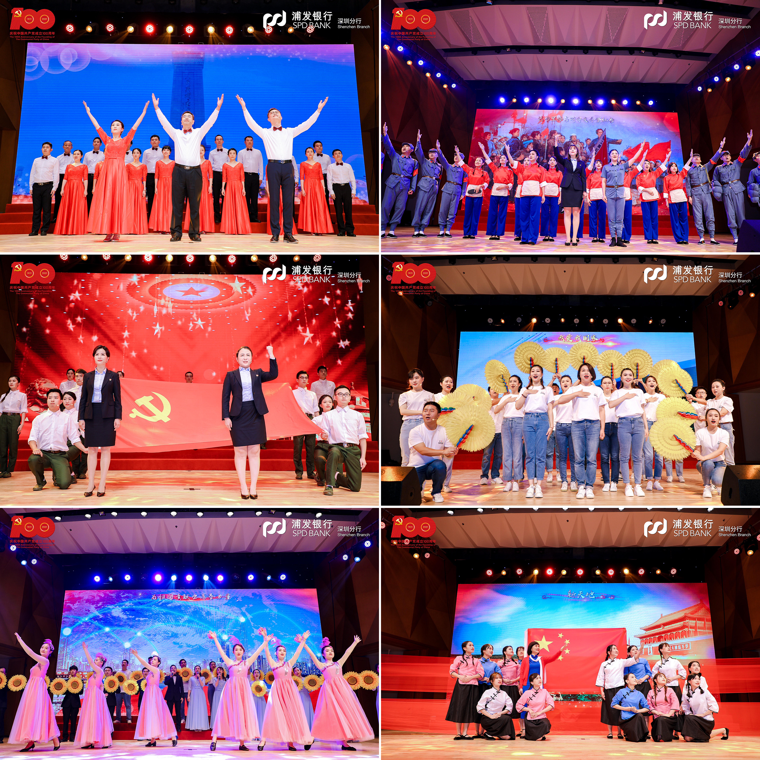 在黨支部風(fēng)采展示環(huán)節(jié),該行基層黨支部精心編排12首紅色經(jīng)典,通過4個篇章再現(xiàn)百年波瀾壯闊的偉大歷程。第一篇章“開天辟地”演繹了中國共產(chǎn)黨在新民民主義革命時期完成救國大業(yè)的輝煌歷程,《保衛(wèi)黃河》吹響了高亢嘹亮的愛國號角,《十送紅軍》深情演繹血濃于水軍民情,《繡紅旗》一腔熱血帶著大家重回歌樂山。第二篇章“改天換地”回顧了中國共產(chǎn)黨在社會主義革命和建設(shè)時期完成興國大業(yè)的奮斗史詩,《歌唱祖國》撥動人們最難忘的記憶,《我們走在大路上》展現(xiàn)當年敢闖敢拼的奮進之姿態(tài),《唱支山歌給黨聽》唱出人民心中永恒的贊歌。第三篇章“翻天覆地”再現(xiàn)了中國共產(chǎn)黨在改革開放和社會主義現(xiàn)代化建設(shè)新時期推進富國大業(yè)的光榮壯舉,《在燦爛陽光下》重現(xiàn)春風(fēng)化雨之后的奮斗時光,《國家》打動多少人的赤子之心,《我們的生活充滿陽光》訴說了改革開放背后的喜悅。第四篇章“驚天動地”展現(xiàn)了中國共產(chǎn)黨在中國特色社會主義新時代推進并將在本世紀中葉實現(xiàn)強國大業(yè)的偉大時代,一首《天耀中華》是浦發(fā)人最深沉的表達,《燈火里的中國》讓人漫步燈火漫卷的萬里山河,《再一次出發(fā)》展示浦發(fā)追夢者的雄姿英發(fā)。走過“百年風(fēng)雨”,浦發(fā)銀行深圳分行合唱團一首《我和我的祖國》,蓬勃朝氣盡顯拳拳愛國心、濃濃赤子情。篇章結(jié)束,大家全體起立,高聲合唱《沒有共產(chǎn)黨就沒有新中國》,以最真摯最熱烈的歌聲獻禮建黨百年。