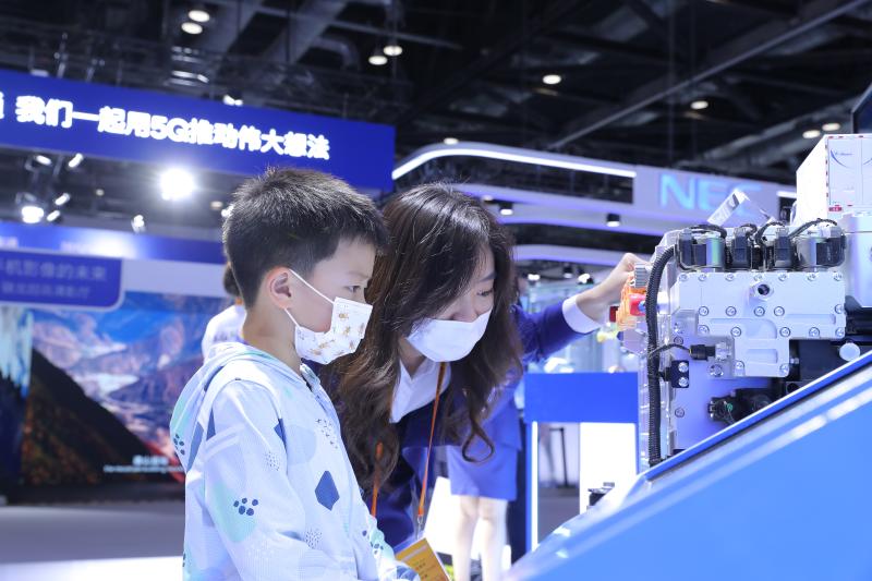 在服貿會現場,一個小男孩躲在奶奶身后好奇的地望著中國太保展臺上的氫能源發(fā)動機。