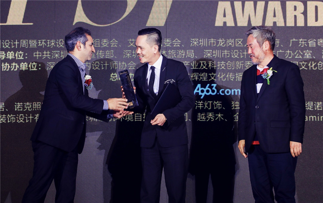 △中央美術(shù)學院建筑設(shè)計研究院院長、博士生導師王鐵,美國Gensler上海公司總監(jiān)Hasan Syed為廣州設(shè)計師黃永才頒發(fā)“最佳娛樂空間設(shè)計獎”