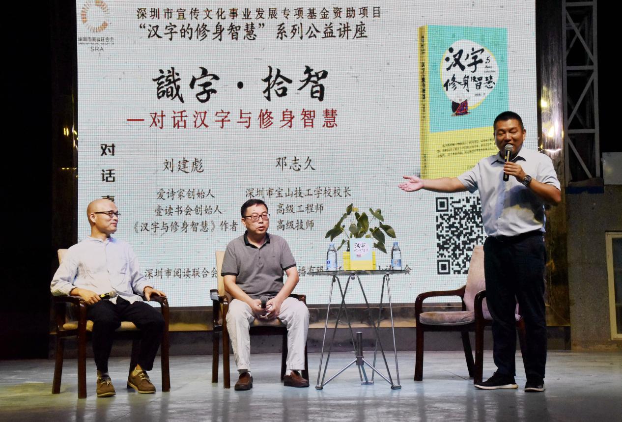 深圳新聞網(wǎng)訊 9月18日晚上7時,由深圳市閱讀聯(lián)合會、深圳市壹書文化傳播有限責(zé)任公司和寶山讀書會共同主辦的“‘識字拾智’——對話漢字與修身智慧”公益文化講座在寶山技工學(xué)校寶山大舞臺拉開了序幕。據(jù)悉,這是由深圳市宣傳文化事業(yè)發(fā)展專項基金資助項目“漢字的修身智慧”的第三場公益文化講座,以劉建彪《漢字與修身智慧》新書分享為契機(jī),傳播漢字正能量,讓更多的青少年識字長智,領(lǐng)略漢字文化之精妙。