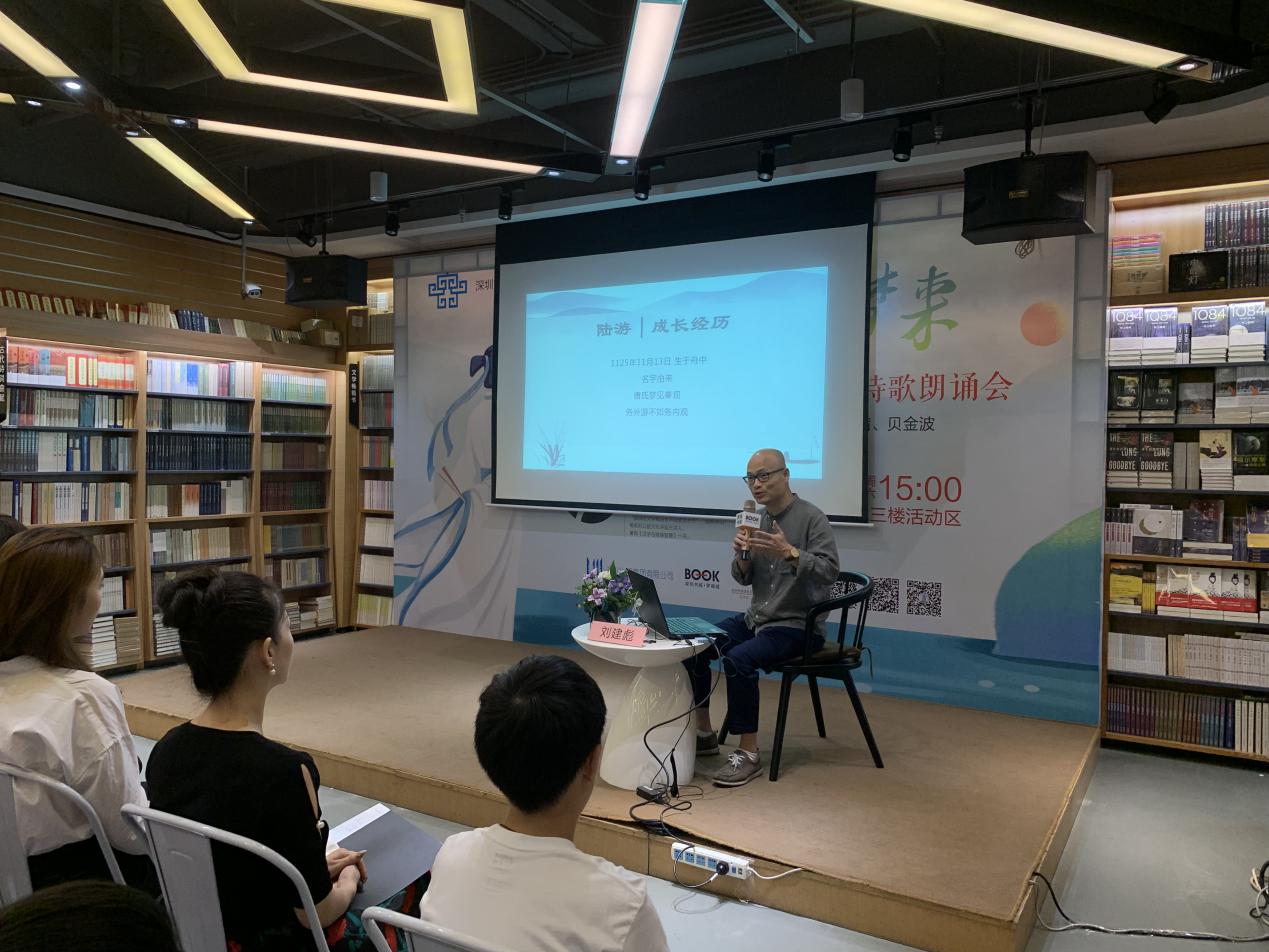深圳新聞網(wǎng)訊 9月21日下午,由深圳市宣傳文化事業(yè)發(fā)展專項基金資助的“新時代中華優(yōu)秀傳統(tǒng)文化進社區(qū)”項目之“鐵馬冰河入夢來”陸游愛國詩詞公益講座暨陸游愛國詩詞朗誦會在羅湖書城三樓活動區(qū)成功舉辦。本次活動由深圳市壹書文化傳播有限責任公司、深圳書城羅湖城共同主辦,壹書閱讀推廣人、愛詩家創(chuàng)始人劉建彪先生擔任主講嘉賓?;顒由形撮_始,現(xiàn)場已座無虛席,觀眾們對講座充滿了期待,更有小朋友們朗誦起了陸游的名句。