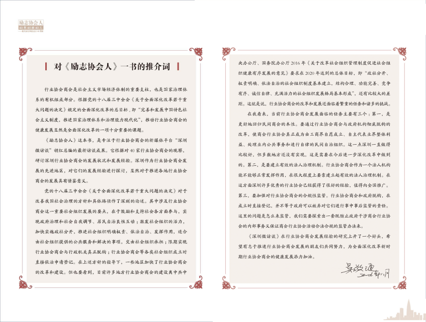 在《勵志協(xié)會人》40年40家40人的編著過程中,得到社會各界的關(guān)注、支持和高度肯定, 著名的經(jīng)濟(jì)學(xué)家吳敬璉說《勵志協(xié)會人》研討了深圳行業(yè)協(xié)會商會的發(fā)展?fàn)顩r和發(fā)展經(jīng)驗。深圳微訪談在行業(yè)協(xié)會商會發(fā)展經(jīng)驗的研究上開了一個好頭,希望有志于推進(jìn)行業(yè)協(xié)會商會發(fā)展的朋友們共同努力,為全面深化改革新時期行業(yè)協(xié)會商會的健康發(fā)展添力加油。