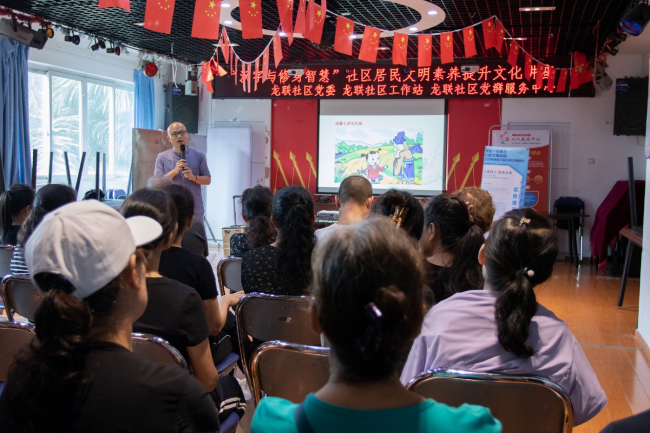 11月13日上午,本系列活動的第六場講座在龍聯(lián)社區(qū)工作站拉開了序幕。講座開始前,現(xiàn)場聽眾每人手上都拿到一本《深圳市民公約》小手冊和《漢字與修身智慧》學(xué)習(xí)資料,劉建彪老師首先跟大家互動:“我們需要什么樣的家園?文明城市從哪里開始?”“美麗、溫馨、文明、和諧的家園”,臺下一位叔叔的聲音尤其洪亮,劉老師及時肯定了他的回答。劉老師接著說,文明城市從人開始,人是建設(shè)文明城市的中堅力量,他進一步補充道,做文明人的第一步是轉(zhuǎn)變思想,只有了解并認同文明的重要性,才會自覺地踐行文明禮儀,積極參與城市文明的創(chuàng)建。