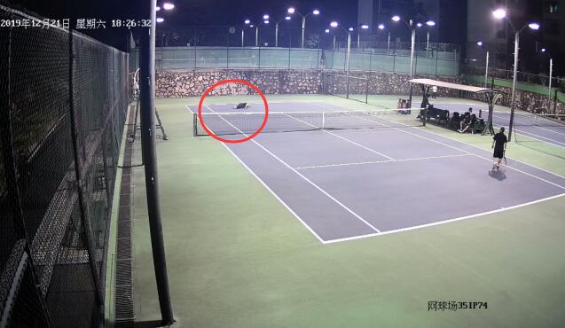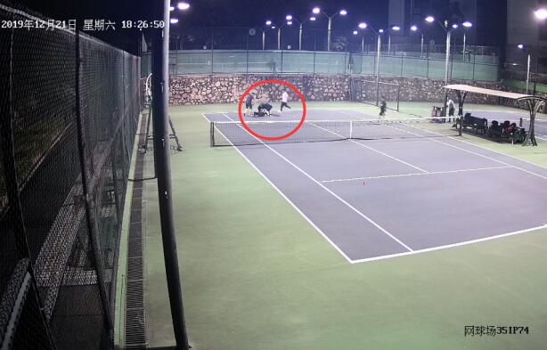圖:正在打網(wǎng)球的李老伯(遠處倒地者)突然倒地失去意識。