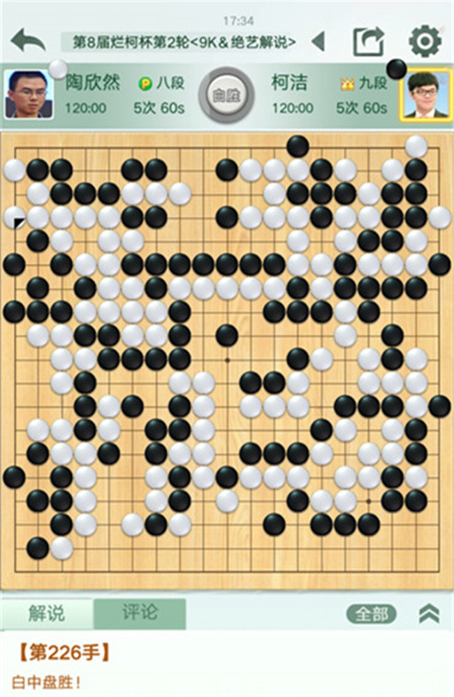本局陶欣然執(zhí)白后行,以極具觀賞性的大模樣開局,將局面導(dǎo)向他擅長(zhǎng)的進(jìn)攻節(jié)奏。在中腹的作戰(zhàn)中,白方判斷精準(zhǔn),棋感敏銳,保持了很高的AI吻合度,一直良好地把握著局面。行至后半盤,黑方柯潔開始了他擅長(zhǎng)的逆風(fēng)攪局,多處挑起劫爭(zhēng)。好在陶欣然未出大錯(cuò),在混亂的局面下穩(wěn)住了局勢(shì),保持優(yōu)勢(shì)直至226手黑方投子認(rèn)負(fù)。