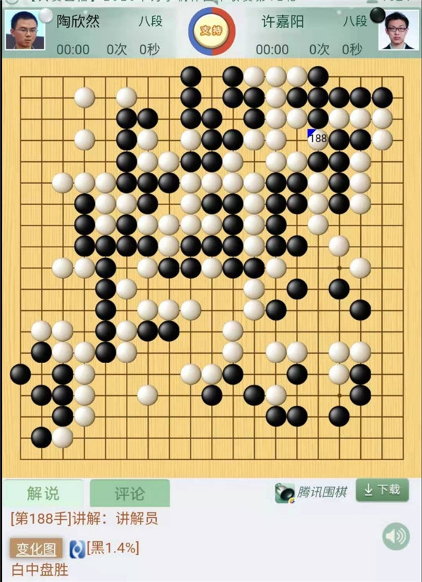 第一臺慢棋,由深圳隊的陶欣然八段執(zhí)白對陣江西隊的許嘉陽八段。雙方開局平穩(wěn),中盤黑棋侵消左邊白棋大模樣時行棋過分,遭到白棋反擊后黑棋較為危險。隨即作戰(zhàn)形成對殺,白棋沒有下出簡明的快一氣變化,連續(xù)失誤后形成黑棋有利的劫爭。劫爭中黑棋卻出現(xiàn)嚴重失誤,由殺白變成了白棋便宜巨大的轉換,最終投子認負,陶欣然執(zhí)白中盤勝許嘉陽。