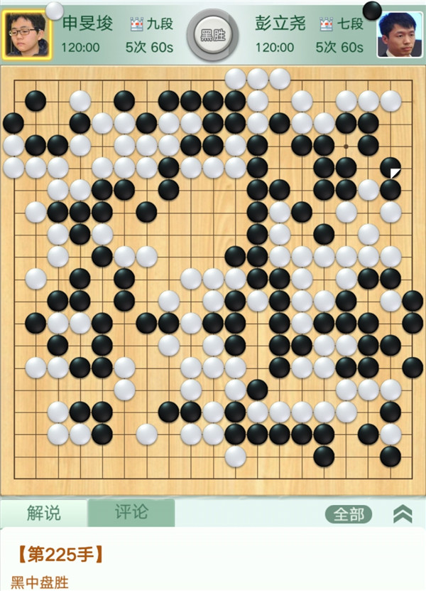 第三臺慢棋,由深圳隊外援申旻埈九段執(zhí)白對陣彭立堯七段。開局右邊黑棋行棋過分,但白棋對殺時出現(xiàn)較大失誤,將雙活走成被殺,黑棋大幅領先。之后黑棋右上角又出現(xiàn)失誤,將一塊棋送死,局面接近。上方作戰(zhàn)雙方都有一定的失誤,形勢劇烈波動,最終形成打劫。黑棋依仗劫材有利,放棄左上角將右上吃掉白棋棋筋活出,便宜巨大,獲得最終勝利,申旻埈執(zhí)白中盤負彭立堯。這一盤,教練羅洗河九段認為“下得是真奇葩!”