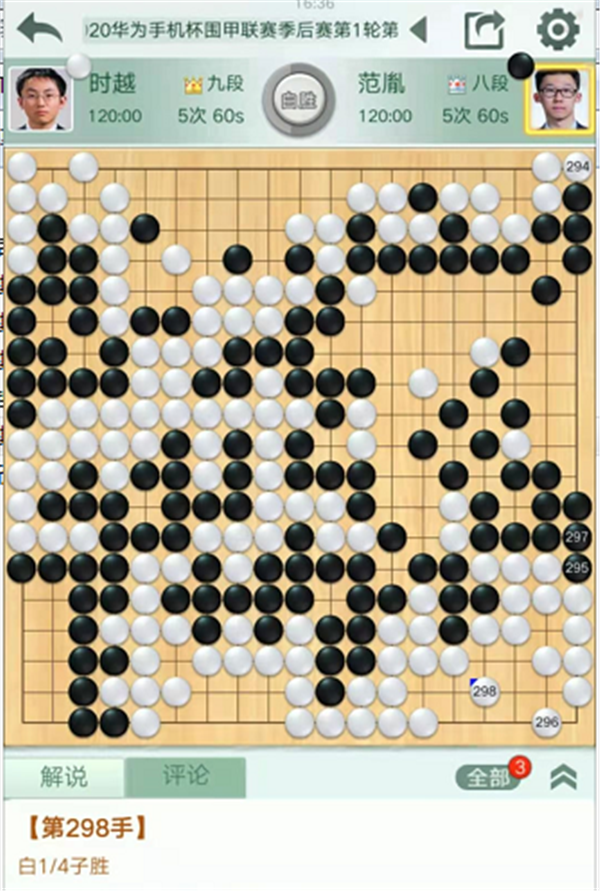 慢棋臺第四臺由深圳隊的時越九段執(zhí)白對陣民生隊的范胤八段。中盤右邊白棋進入黑空形成打劫,劫活后局面領(lǐng)先。中央黑棋進攻白棋時候失誤,白棋優(yōu)勢擴大。之后黑棋左邊行棋時候,白棋一直沒有脫先搶占右邊大棋,而是在左邊連續(xù)失誤并且落了后手。被黑走到右邊后黑棋大幅領(lǐng)先。之后右下角形成復(fù)雜的打劫,黑棋可以選擇走成三劫循環(huán)和棋后加賽,但是黑棋判斷即便放棄和棋也是局面有利。實戰(zhàn)白棋一直不補搶收官子,最終判斷獲勝時候?qū)⑷傺h(huán)變化解消,白棋1/4子獲勝。時越1/4子勝范胤。