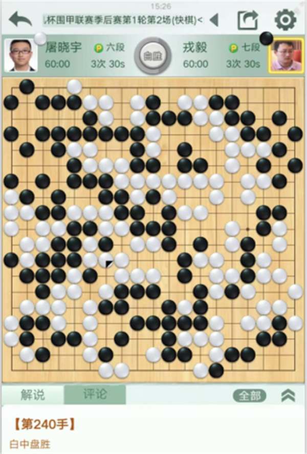 快棋臺由深圳隊戎毅七段執(zhí)黑對陣民生隊的屠曉宇六段。開局黑右上失誤失被白棋先手封住頭,虧損。中盤左邊作戰(zhàn)時候也應(yīng)該中央出頭,實戰(zhàn)貪吃左邊白棋,被白棋外側(cè)滾打包收后劣勢擴大。之后黑棋左下隱患沒有及時自補,被白棋將左下角吃掉,局面已經(jīng)難以挽回。戎毅中盤負屠曉宇。