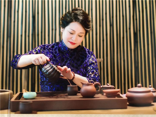 唐朝霞老師用獲獎的蜂菊壺泡茶。