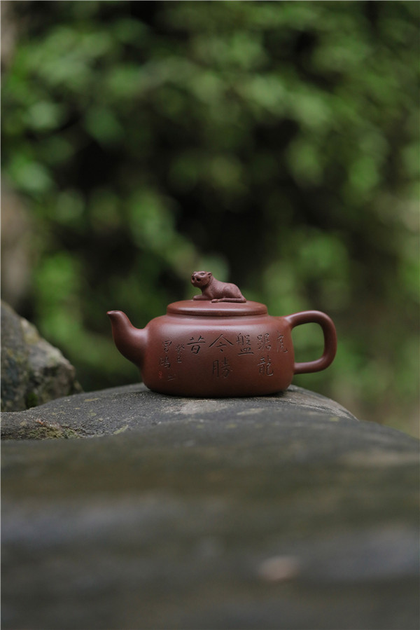 第四件,《臥虎藏龍壺》為平蓋、方肩、圓底,造型敦厚,穩(wěn)重古樸。壺鈕塑以遠眺的臥虎,壺底則暗藏浮雕團龍。兩者相向呼應,于平淡中藏奇趣。