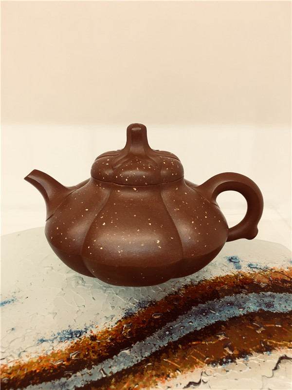 第五件,《笑雪壺》取材于中國傳統(tǒng)名花之梅花的形態(tài),壺鈕為花蒂,壺身等分成六瓣花瓣,圓潤飽滿,宛如盛開的梅花,壺嘴與壺把做成簡化的梅花枝干。顯得蒼勁鋼遒,壺以鋪砂做裝飾,以雪花紛紛飄落,表現(xiàn)出梅花傲霜迎雪,傳春報喜的吉祥寓意。此壺筋囊飽滿凝重,通體線條流暢,細節(jié)表現(xiàn)精巧,立意新穎,妙趣天成。