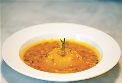 這道菜選擇泰國的西米、江西的紅米、美國的野米、東北的小米和河北的燕麥5種雜糧,預(yù)先浸泡蒸熟備用。半個蘋果削皮浸泡鹽水后蒸熟備用。將南瓜蒸熟后用破壁機打成南瓜茸,放入平底鍋,小火加熱,放入五谷雜糧慢慢推至均勻。這道菜神奇的地方,在于如果你喜歡甜,可以放糖作為飯后甜品;如果你喜歡咸味,則可以放鹽,作為代餐主食。調(diào)好味道后,放入蘋果加熱到溫度適合,就可以上碟。