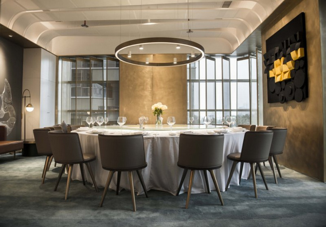 以黑色和金色為主色調(diào)的梧桐PLUS,選用流動的線條對餐廳空間進(jìn)行分割。桌與桌之間的距離保證了食客對話的私密性和安全性。即使沒有預(yù)定到包廂,也不用擔(dān)心旁邊食客的閑聊會影響到彼此。