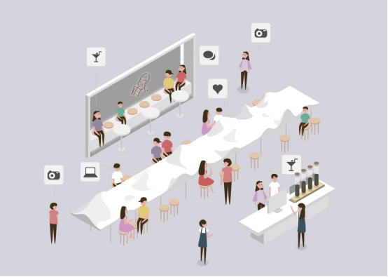 ? 喜茶白日夢計劃“相遇”、“山溪澗”、“山外山”構成一場大型空間實驗,你可以自由地“一人小憩”,也可以制造“二人時光”的浪漫,還可享受“多人相聚”的歡樂。三家DP店都運用了鏡面反射的設計手法,其中“ 相遇”是平整不銹鋼的鏡面,反襯桌面不同群組人們的活動場景,空間明亮開闊的同時,讓人們體驗到在喜茶門店中新的相遇方式。