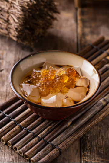 冰粉冰涼香甜、嫩滑爽口,桃膠清血降脂、抗皺嫩膚,為涼滑冰粉增添糯口,紅糖汁為冰粉與桃膠賦予一層清甜,夏日不可不吃的一道生津解暑、清涼降火的美味。