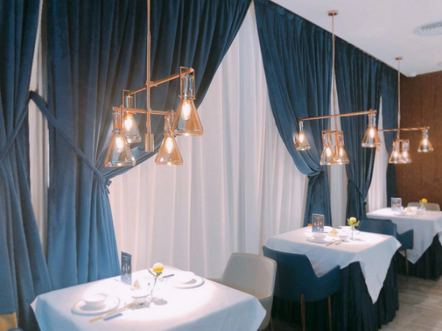 密室的大門,區(qū)隔開的完全是兩種不同的風格。實驗室風格VS LOFT風,密室玩的是神秘的科學實驗室氛圍,大堂則是完全敞亮通透的空間,整體以大叔紳士藍、玫瑰金為主色調,線條利落的天花板吊頂,吊燈暖暖的光線投射在擺放講究的餐具上,浪漫又小資,再搭配大理石紋水泥地磚、木紋墻藝等,讓整個空間保持和諧統(tǒng)一的氛圍,又展現(xiàn)出豐富的層次感。廚房直接采用明檔的空間設計,衛(wèi)生情況一目了然,除了大堂,還設有特色VIP室和半透明宴會廳,適合有重要會談和生日宴會需求的朋友。