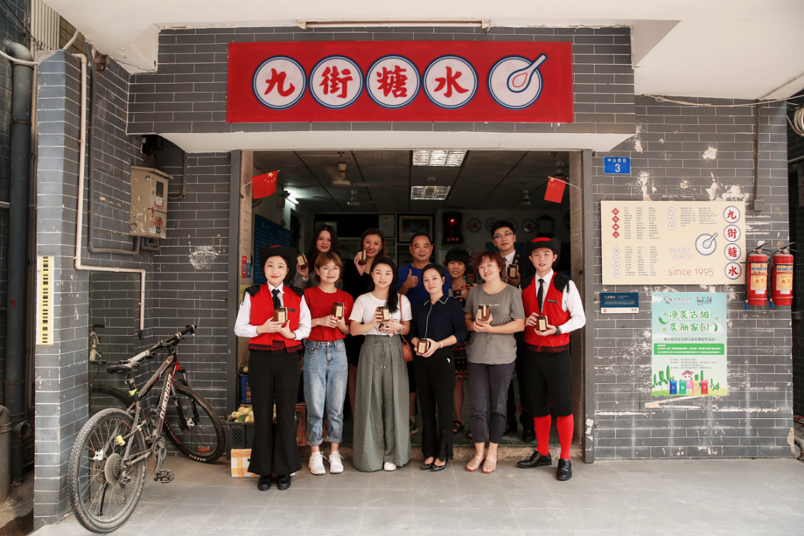 在禮賓司的引領(lǐng)下,大家來到已有千年歷史的文化遺產(chǎn)——南頭古城。一行人在“九街糖水鋪”入座,店主夫妻倆熱情的端出清甜可口的化州糖水和香氣四溢的潮州炒米粉,和我們嘮起了家長里短。大家方才得知,這宛如尋常百姓家的糖水鋪竟開業(yè)于1995年,見證了古城九街的變遷翻新和故去新來的幾代人潮川流。帶著傳播化州糖水美名初衷的糖水世家選擇在深圳發(fā)家,傳到這已是第三代。眾人大快朵頤,禮賓司也幫忙跑堂添茶。