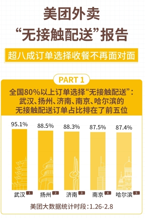 報(bào)告顯示,在1月26日至2月8日期間,在使用“無接觸配送”服務(wù)占比最高的城市中,武漢、揚(yáng)州、濟(jì)南、南京、哈爾濱排在了前五位。從用餐人數(shù)來看,2人份及以上餐食占總體訂單的比例相比較平時(shí)增長(zhǎng)了31.7%。采用“無接觸配送”的訂單占到了整體單量的80%以上,且每一單外賣都使用“無接觸配送”服務(wù)的用戶占到66%。