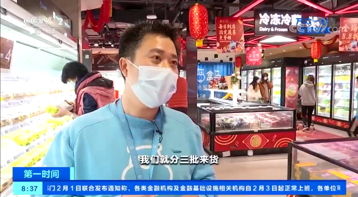 “排面要整理一下?!眮碜院钡溺娞炱绞呛旭R鮮生超市員工,他告訴記者,春節(jié)前,因?yàn)殛懤m(xù)看到疫情的消息,他和愛人取消了返鄉(xiāng)的車票,但這也是他這么多年來所經(jīng)歷的,最不尋常的一個(gè)。初一初二休息的鐘天平,大年初三就碰上了搶購?!邦櫩团砰L隊(duì),從9點(diǎn)鐘排隊(duì)排到1點(diǎn)鐘左右,貨架上的蔬菜、肉以及禽蛋奶,甚至是油米面都被一掃而空。”