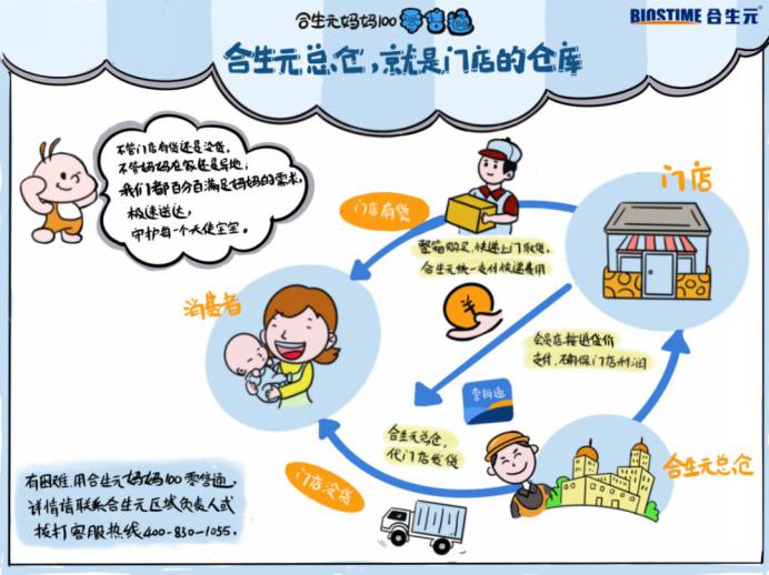 顧客因道路封閉等原因在老家,需要奶粉,和原來(lái)常住地的母嬰門(mén)店老板下單。如果原來(lái)母嬰門(mén)店無(wú)法寄送產(chǎn)品到異地的消費(fèi)者,母嬰門(mén)店老板把需求報(bào)給合生元媽媽100零售通,合生元從自己的總倉(cāng)出貨快遞,利潤(rùn)還計(jì)入原來(lái)門(mén)店的賬上。