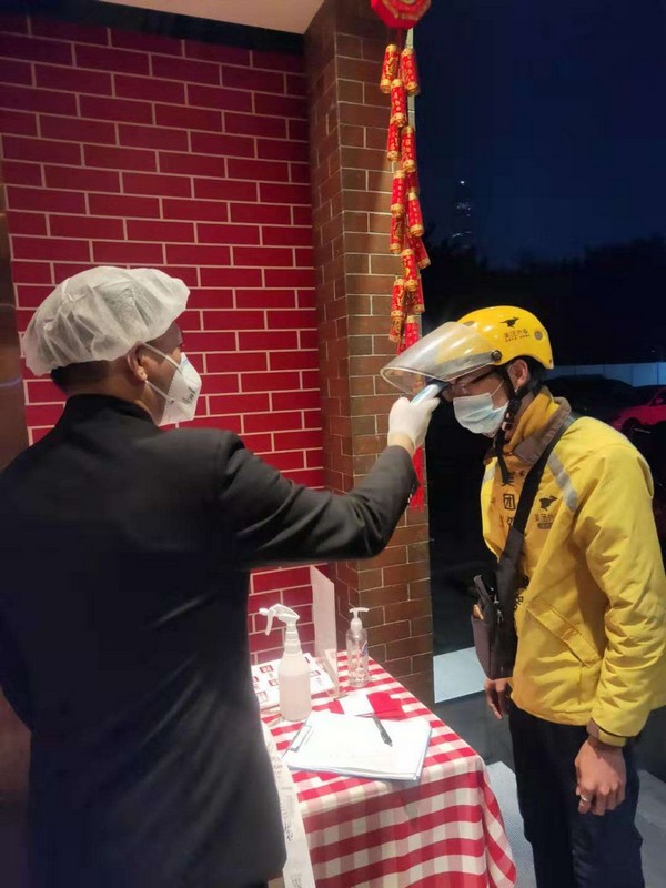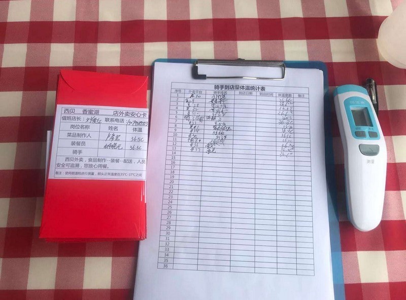 為了保障顧客和員工的健康,深圳西貝要求所有上班前的員工都需每半小時(shí)測(cè)一次體溫,每一個(gè)小時(shí)集中進(jìn)行洗手消毒,公司還為每一位員工配備了符合要求的防護(hù)口罩。不僅如此,來外賣取餐的騎手也和店員分割開在店門口取餐,減少人員之間相互交流與接觸,每個(gè)騎手取餐前,必須接受體溫測(cè)量,手部消毒,確認(rèn)無(wú)誤,才可取餐。