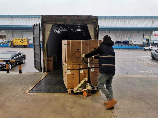 倉庫員工將如新中國捐贈的400臺空氣凈化器出庫