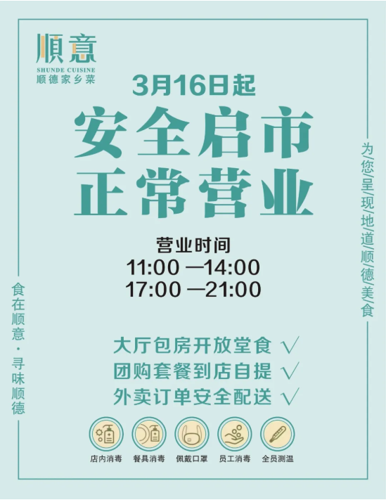為了保證消費(fèi)者和員工的健康,順意順德家鄉(xiāng)菜做足的準(zhǔn)備工作,聘請了專業(yè)公司對全店進(jìn)行專業(yè)消毒凈化,每個員工上崗前均進(jìn)行測量體溫、深度清潔雙手等措施,服務(wù)員在服務(wù)時也秉承無接觸的原則,傳菜加蓋隔離、餐具高溫消毒、到店測溫、安心送等種種服務(wù)讓消費(fèi)者感到安心。