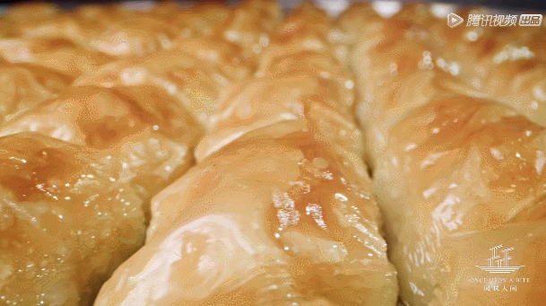 這還沒到核心。巴克拉瓦最關鍵的步驟是熬糖,只有資歷最老的師傅才能掌握,溫度、酸度、水、時間讓糖液達到平衡,于是,我們看到完美的最后一步: