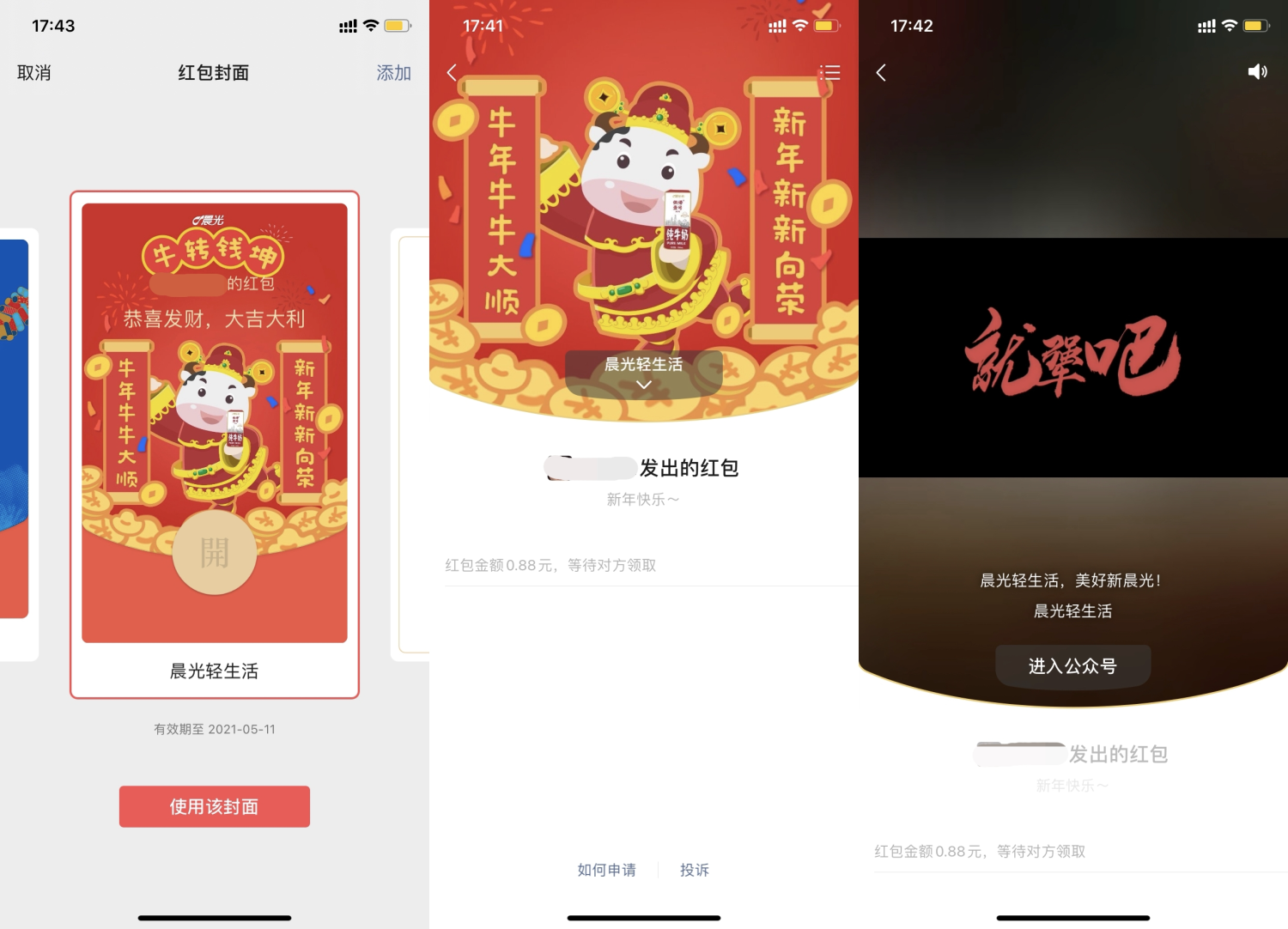 2021年的春節(jié)線(xiàn)上定制紅包封面成為網(wǎng)民熱議的話(huà)題,相較于往年的春節(jié)紅包,各具特色、風(fēng)格不一的紅包封面無(wú)疑是今年最明顯的特色了。晨光乳業(yè)也為此做出了嘗試,針對(duì)晨光牛奶用戶(hù)和粉絲大膽設(shè)計(jì),將憨態(tài)可掬的品牌IP放置在封面C位。無(wú)疑,這波寵粉操作有助晨光牛奶獲得更多粉絲的點(diǎn)贊,增強(qiáng)用戶(hù)粘度。