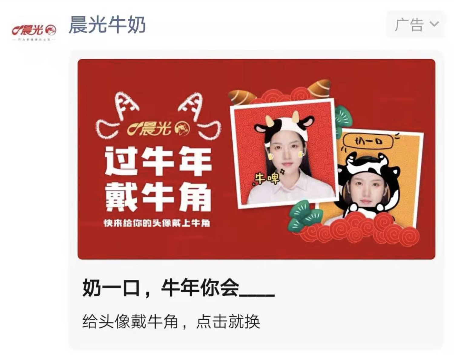 春節(jié),正是各大品牌爭(zhēng)相出招時(shí)刻,如何在一眾營(yíng)銷(xiāo)活動(dòng)中突出重圍吸引用戶(hù)關(guān)注?洞察到用戶(hù)在春節(jié)期間“換個(gè)喜慶頭像”以及“發(fā)紅包”的強(qiáng)需求,晨光乳業(yè)趣味游戲H5“換個(gè)頭像犟牛年”和“定制紅包”于除夕前上線(xiàn),邀請(qǐng)用戶(hù)為現(xiàn)有微信頭像戴上“牛角”。牛角頭像不僅可以用于微信,也可用于其他社交平臺(tái)。